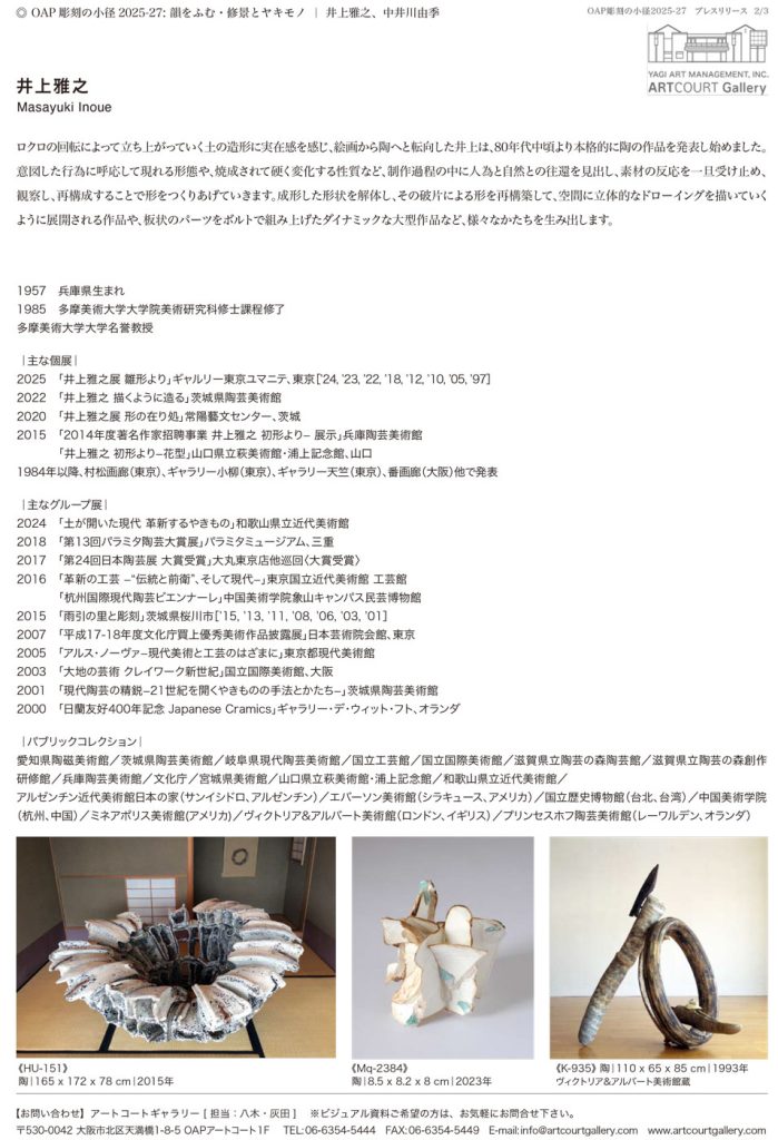 本学陶プログラム名誉教授の井上雅之先生、卒業生の中井川由希さんによる展示が開催されています。