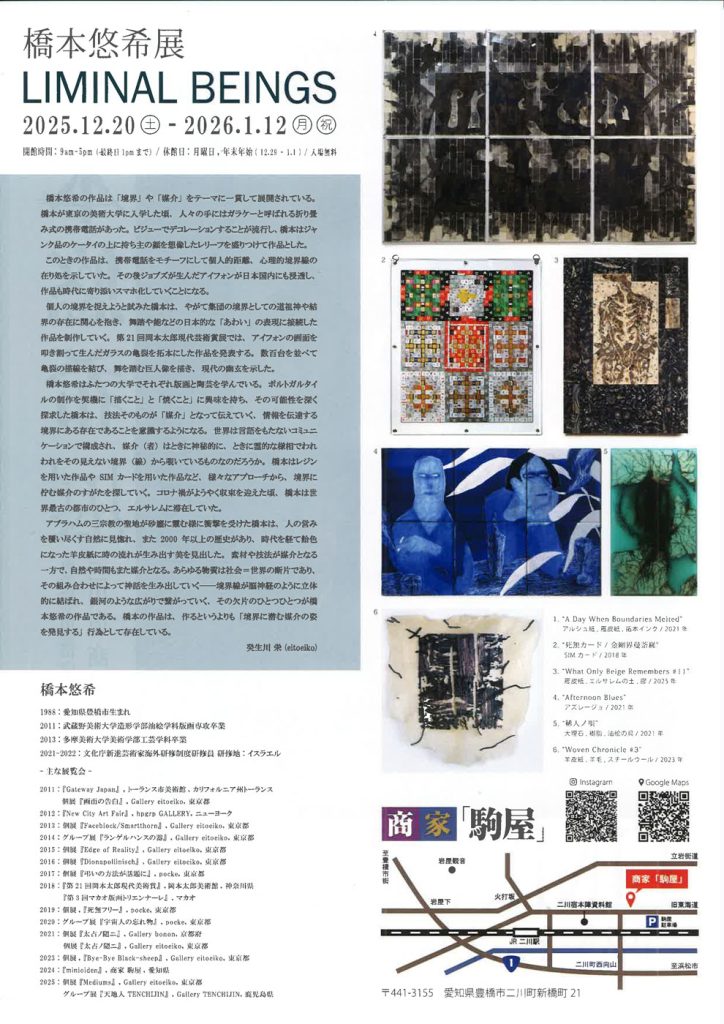 本学陶プログラム卒業生の橋本悠希さんの個展が開催されます。 橋本悠希展「LIMINAL BEINGS」 会期2025/12/20(土)〜2026/1/12(月)※月曜日、年末年始(12/29〜1/1)は休館。入場無料 時間9:00〜17:00(最終日は13:00まで) 場所豊橋市指定有形文化財 二川宿 商家「駒屋」 住所〒441-3155愛知県豊橋市二川町新橋町21