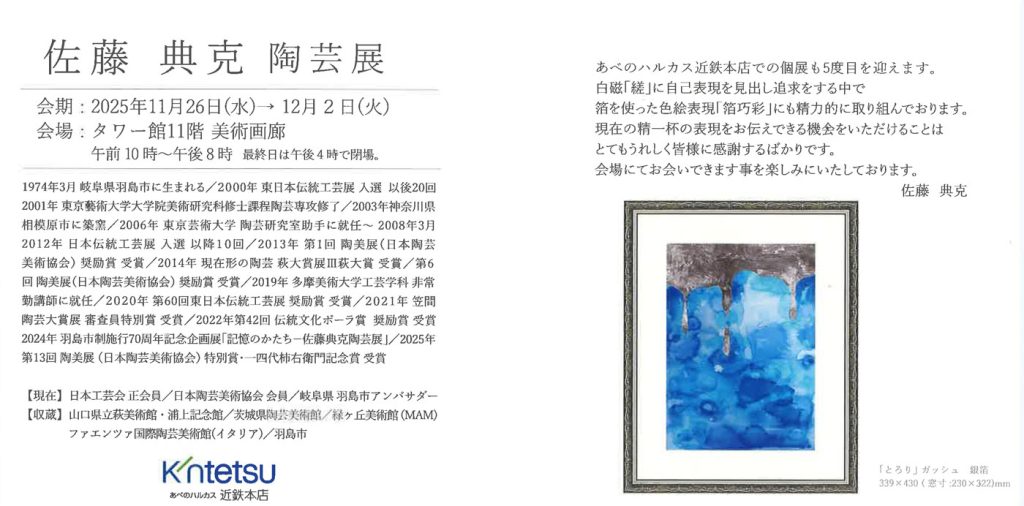 本学陶プログラム非常勤講師の佐藤典克先生の個展が開催されます。 「佐藤 典克 陶芸展」 会期2025/11/26(水)〜12/2(火) 時間10:00〜20:00 ※最終日は16:00まで 場所あべのハルカス 近鉄本店タワー館11階 美術画廊 住所〒545-6016 大阪府大阪市阿倍野区阿倍野筋1丁目1−43
