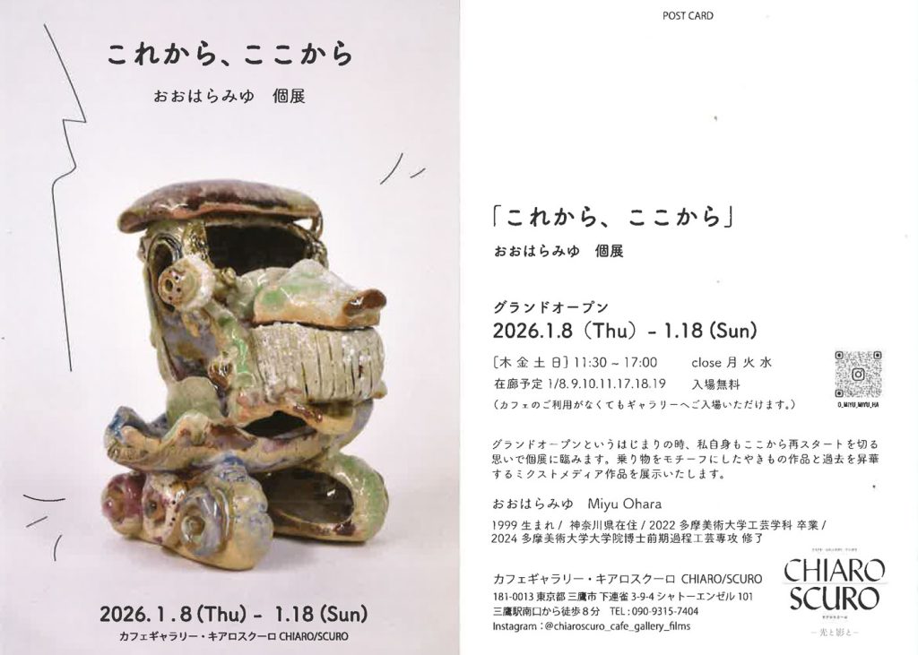 本学 陶研究室の職員である おおはらみゆさんの個展が行われます。 会期1/8(木)〜1/18(日) 時間11:30〜17:00 休廊月・火・水曜日休廊 場所カフェギャラリー・キアロスクーロ CHIARO/SCURO 住所〒181-0013東京都三鷹市下連雀3-9-4 シャトーエンゼル 101