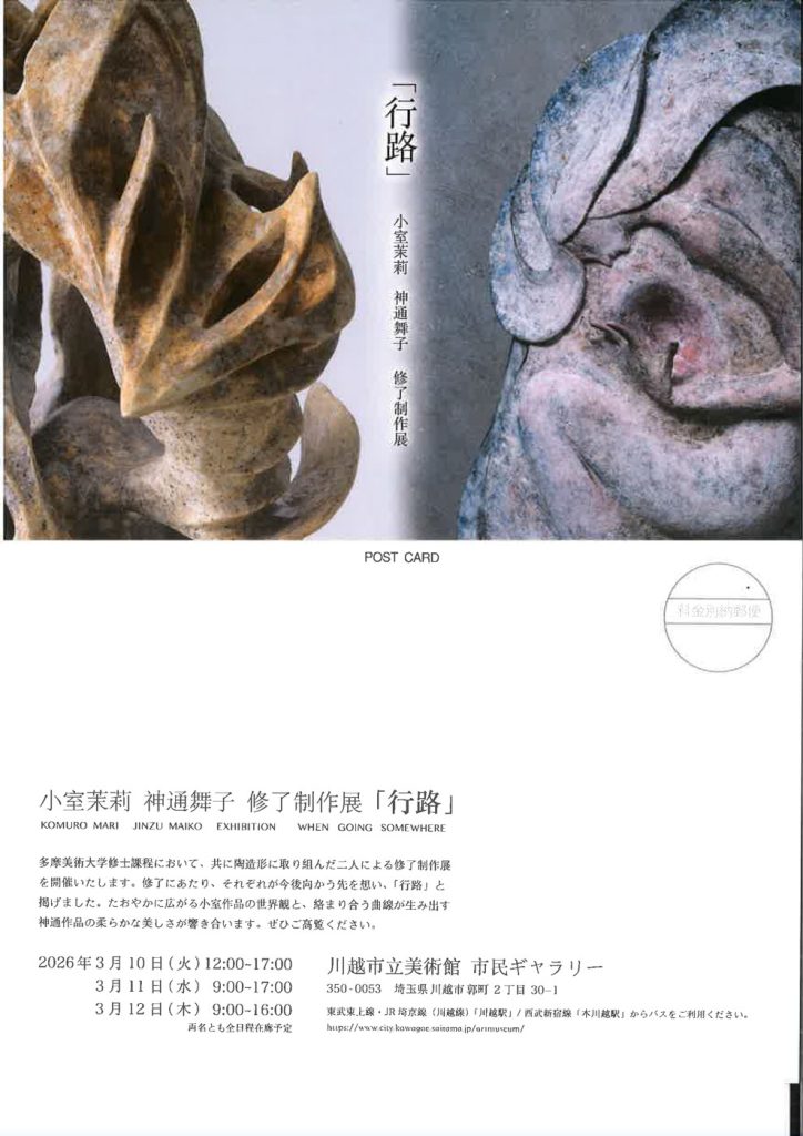 本学陶プログラム大学院生の展示が行われます。 小室茉莉 神通舞子 修了制作展「行路」 会期/時間2026年3月10日(火) 12:00〜17:00 3月11日(水) 9:00〜17:00 3月12日(木) 9:00〜16:00 会場川越市立美術館 市民ギャラリー 住所〒350-0053埼玉県川越市郭町2丁目30-1